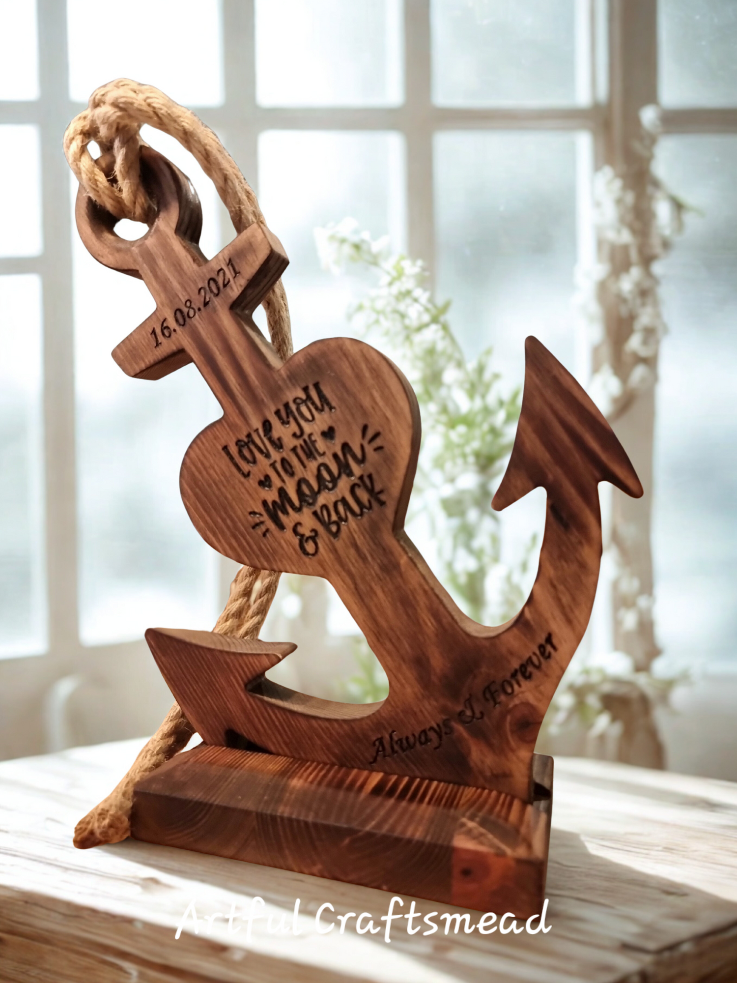 Unique handcrafted wooden décor pieces featuring carved symbols such as anchors, horseshoes...