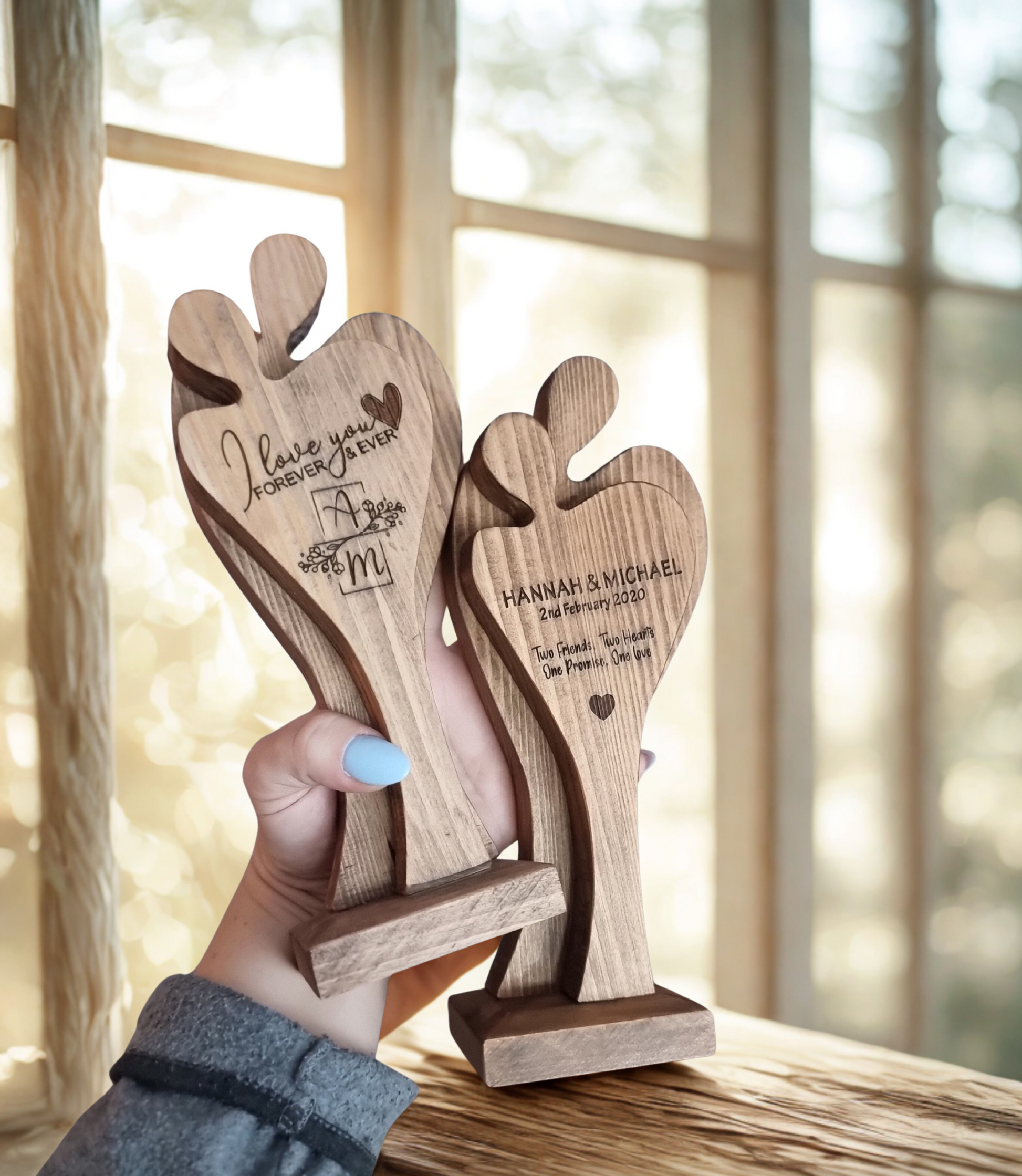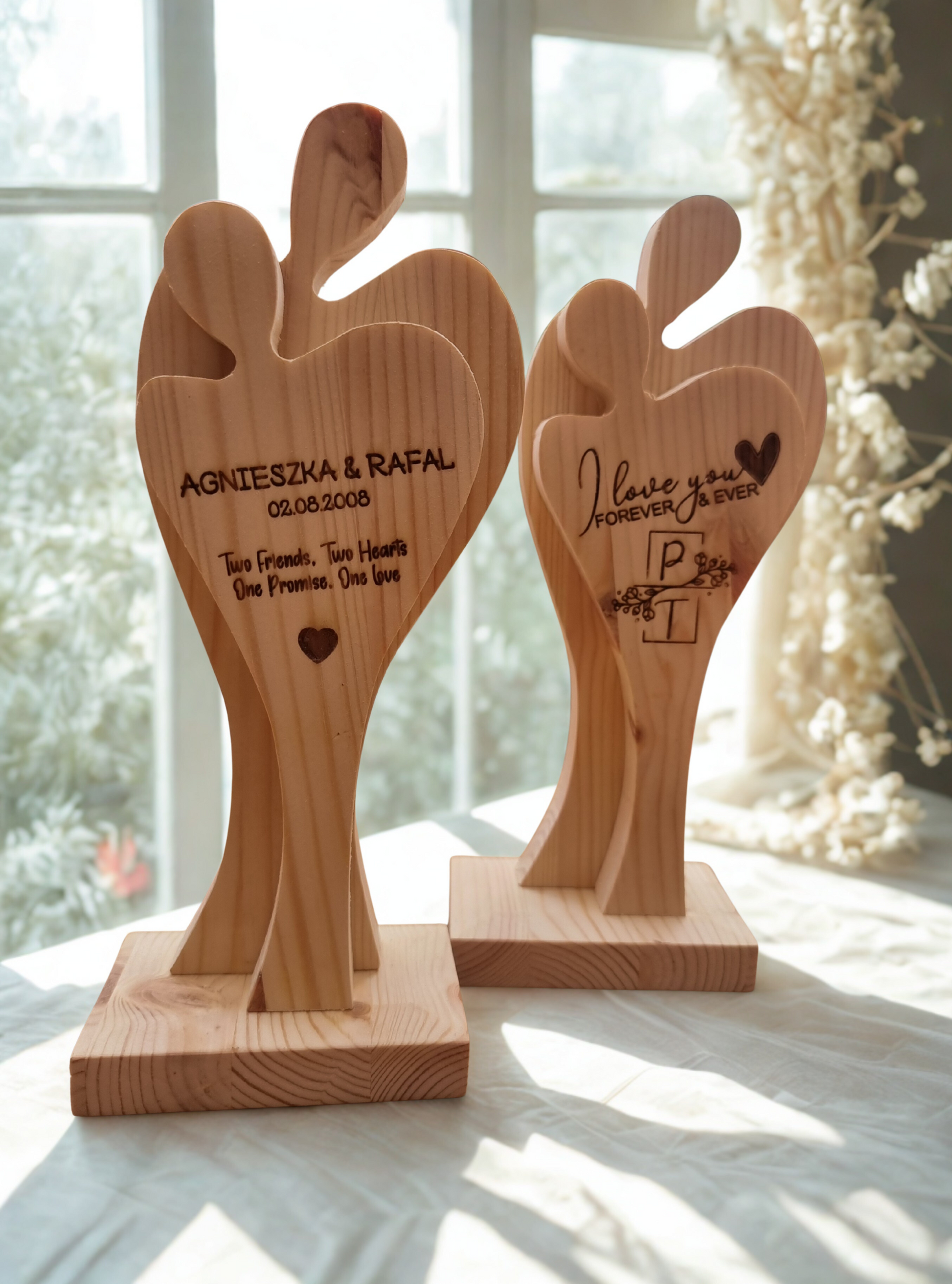 Hand-carved wooden couple sculpture made from solid pine wood. Personalised love decor with custom text. A unique wedding or anniversary gift.