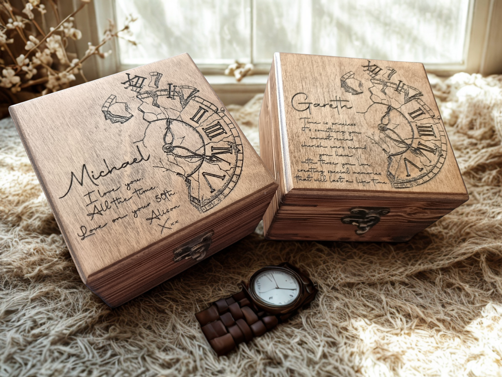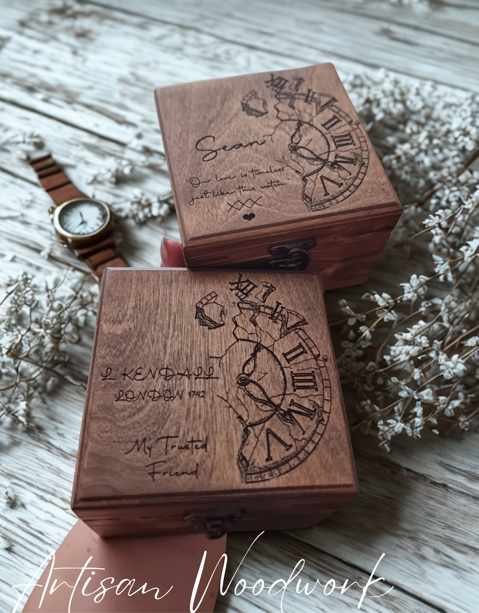 Each box is made to order in our UK workshop. Choose your preferred stain colour, then decide whether you would like personalisation. If you select “Custom name & text”, simply enter your details in the field provided. You may add a name (up to 3 words) and/or a short quote. If no text is entered, the box will be made with the original design shown in the photos.