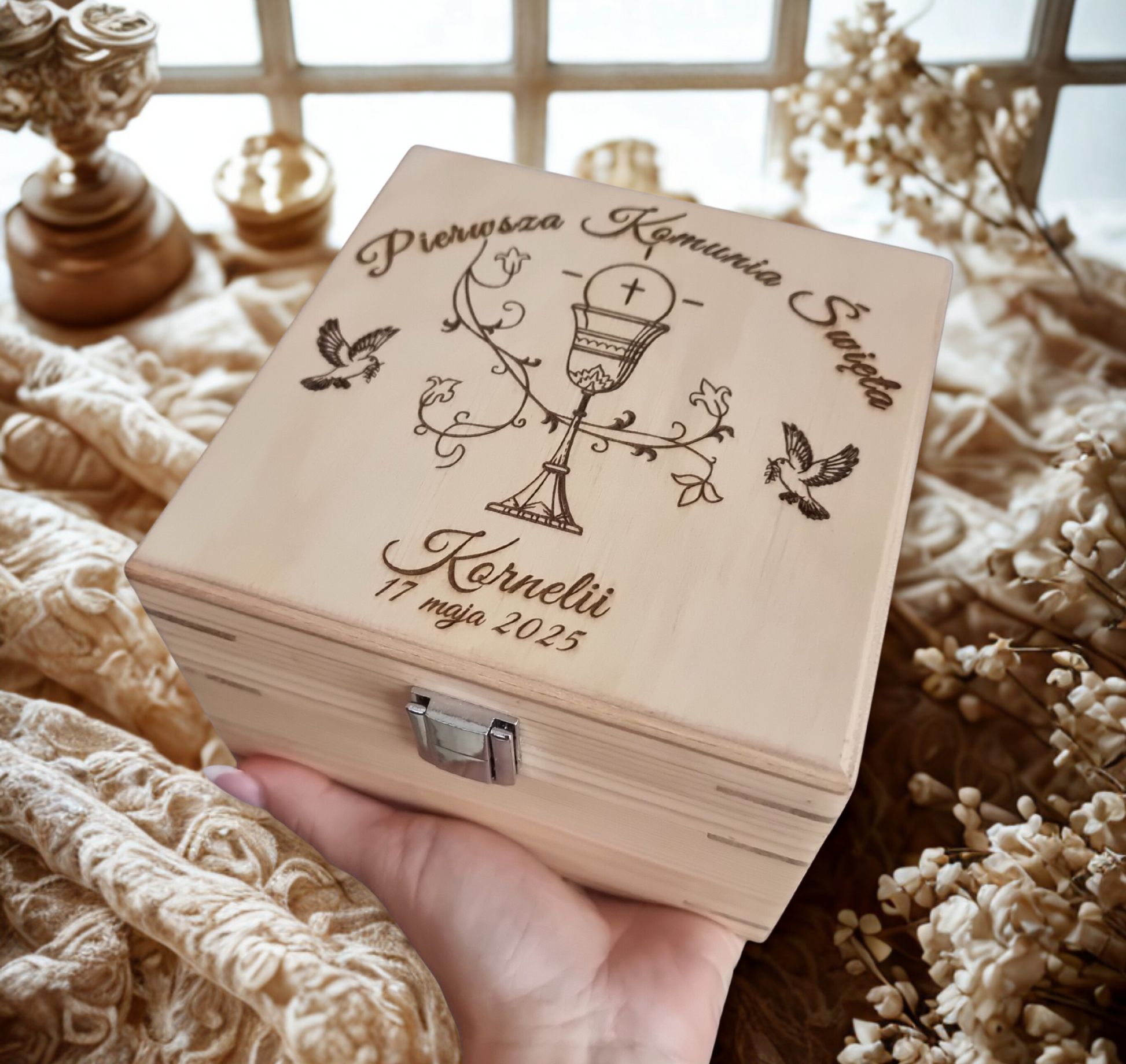 This personalised wooden keepsake box is handcrafted as a meaningful gift for First Holy Communion, but can also be fully customised for Baptism or Confirmation by changing the wording on the lid.