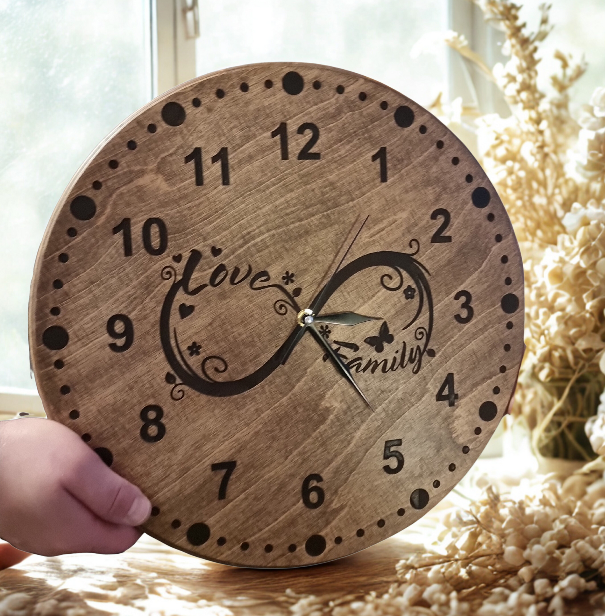 Personalised Wooden Wall Clock with Infinity Symbol – Silent Mechanism